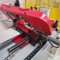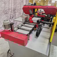 Med ilgangsarm, dråbesmøringsanlæg, spåntransportør og automatisk smigskæring til begge sider. Efter endt programmering drejer savbuen automatisk om i første programmerede smig og fører emnet frem, hvilket sker samtidigt. NC styring for programmering af længder og styktal. 1000 mm. flergangsfremføring.