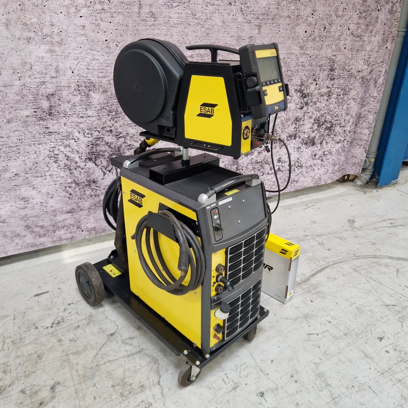 With Esab Feed 4804 wirebox with pulse and synergic, Cool 2 water cooling unit, 4-wheel wire feed, wagon, and new Esab 4 m. Exeor PSF 420W welding hose.