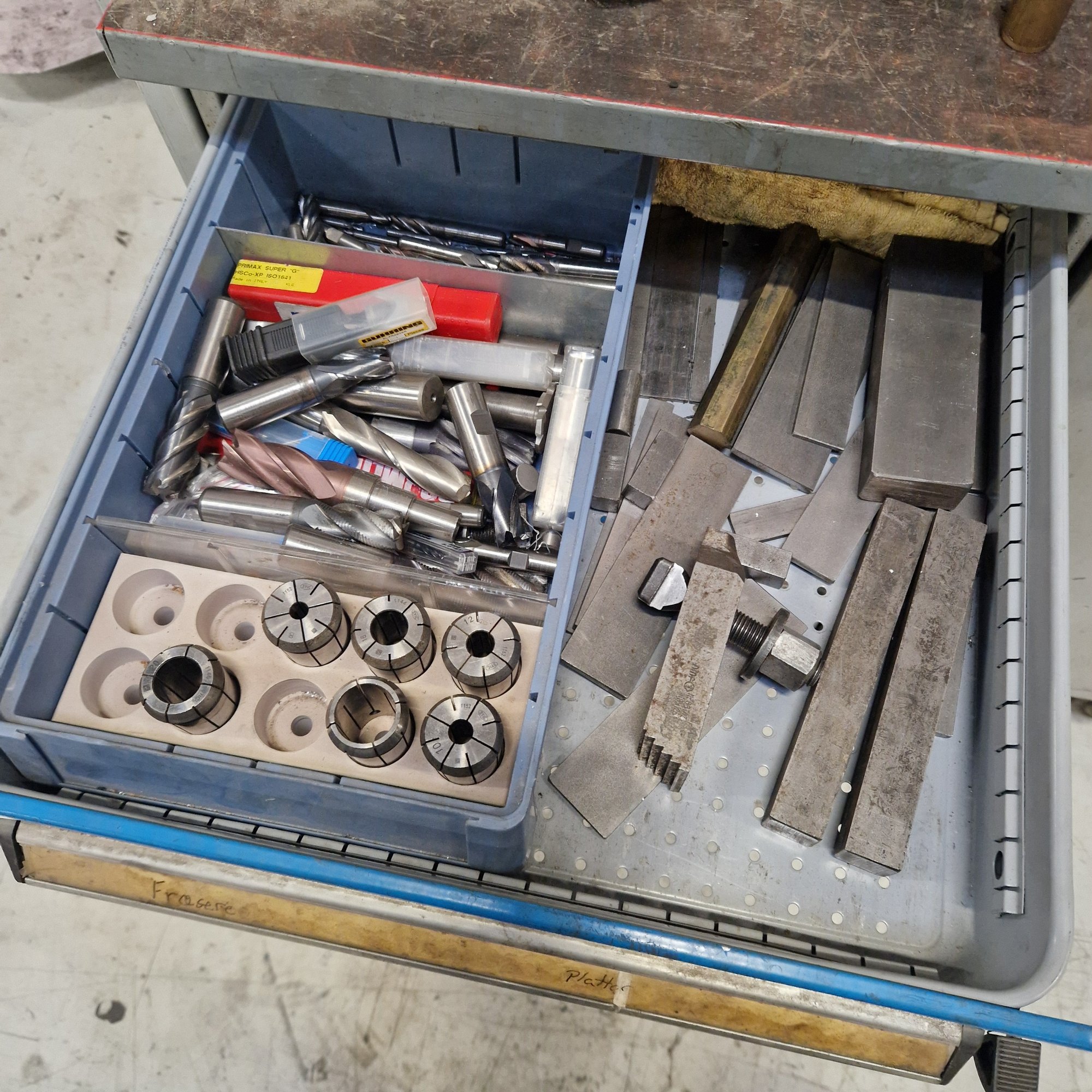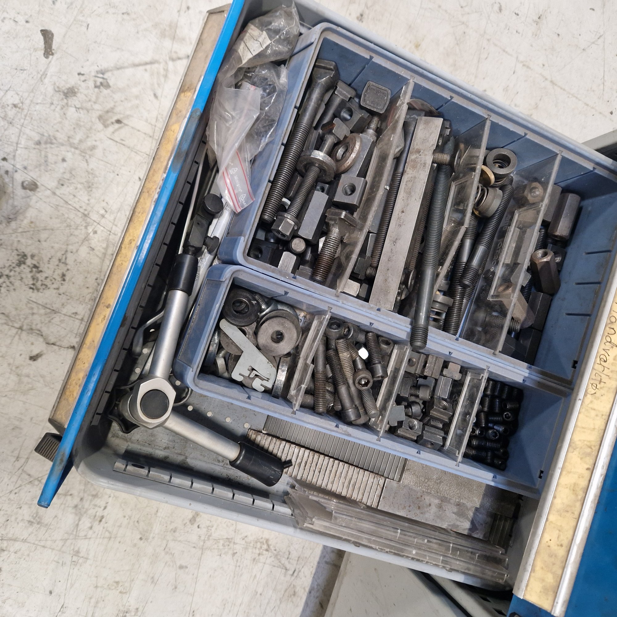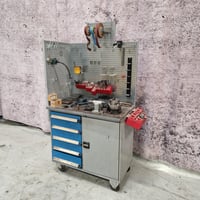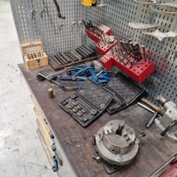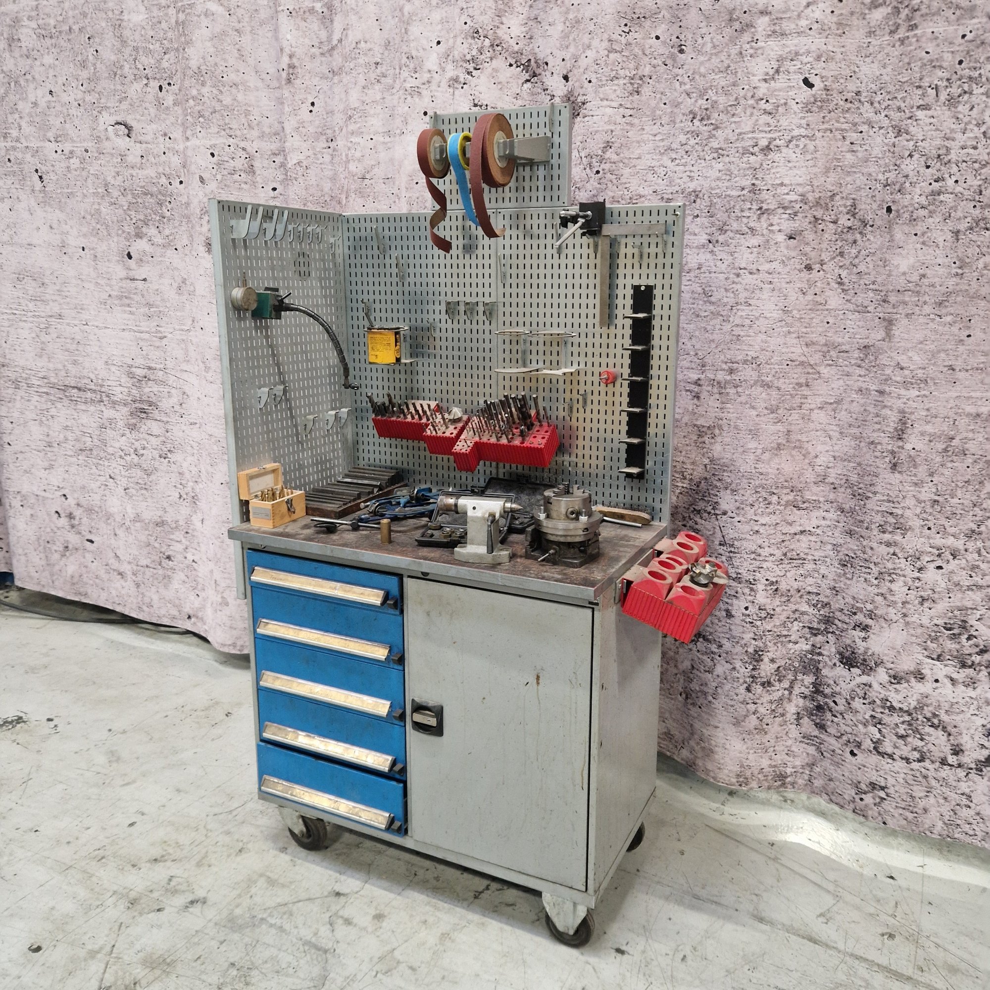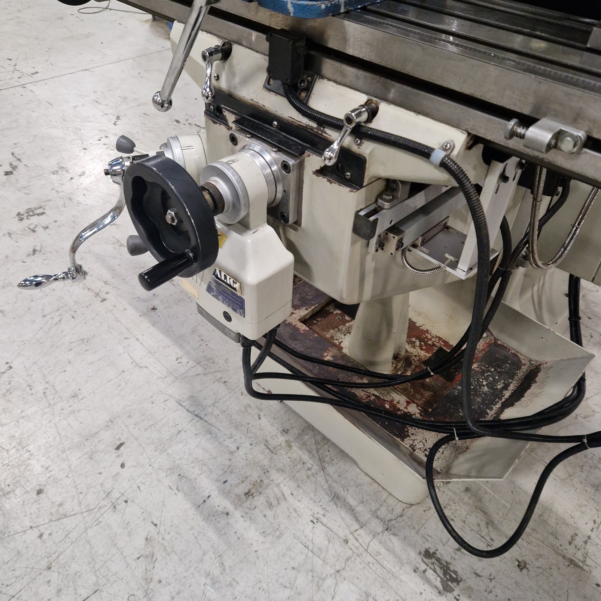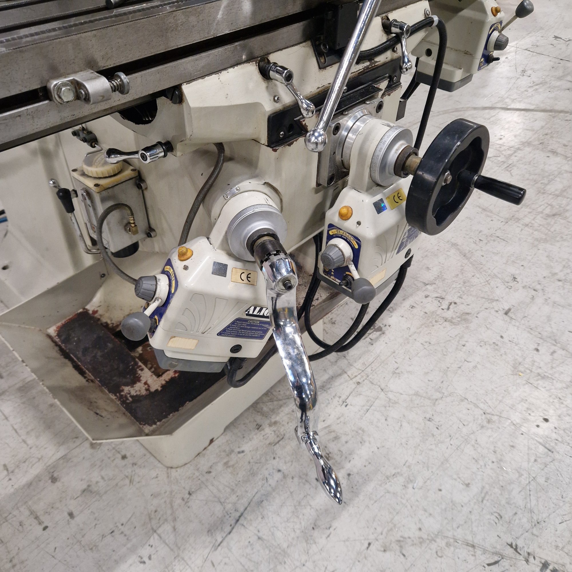 With pneumatic tool clamping, drilling function in head with automatic feed (travel 130 mm.), vice, indexing table and lots of equipment.